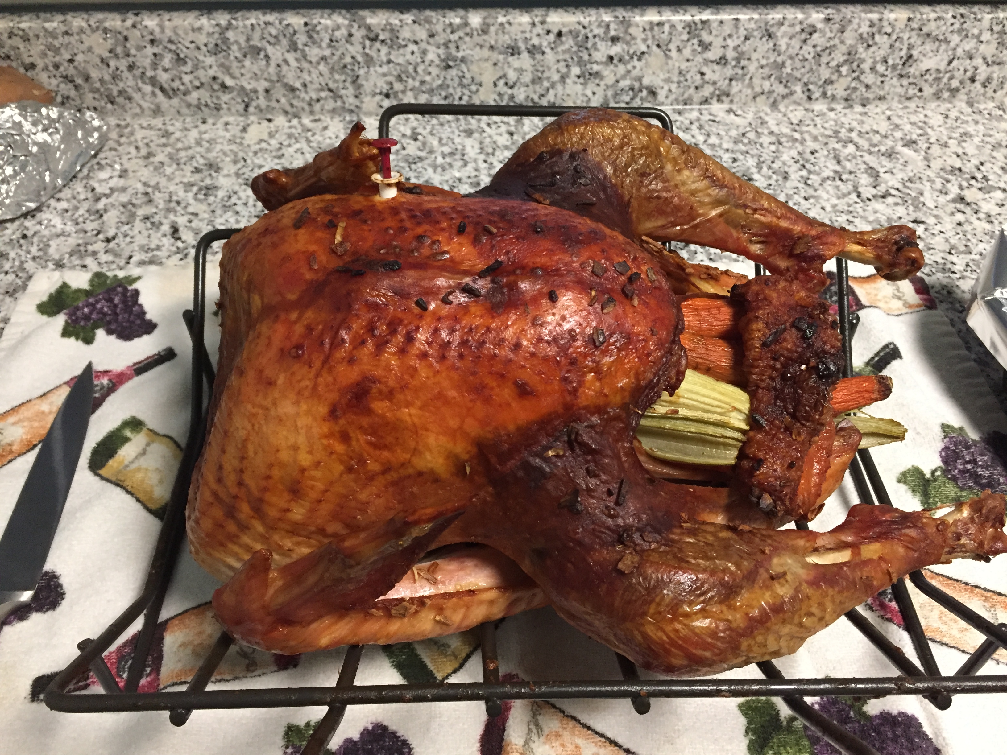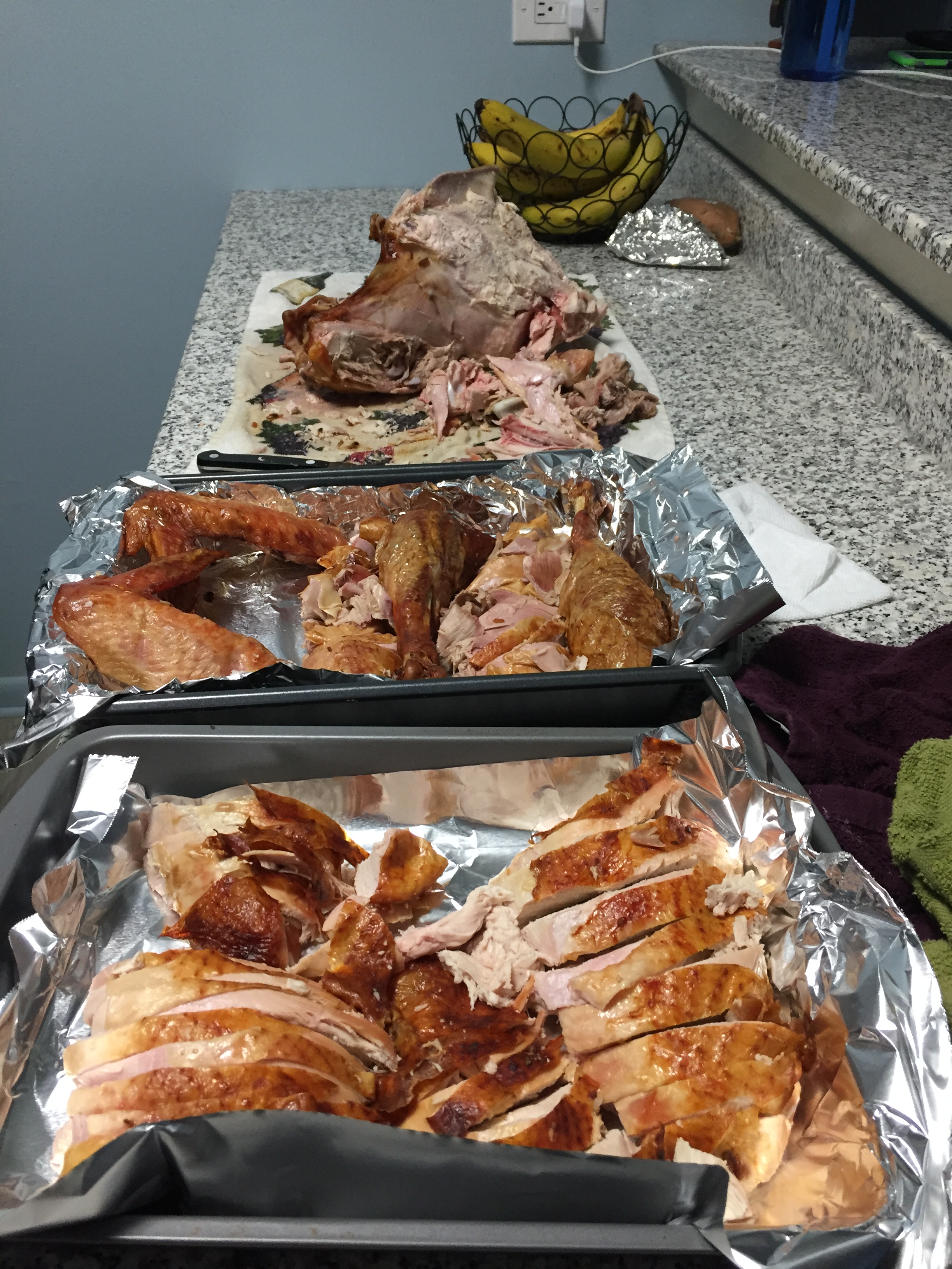 Turkey (day of): Oh the stress of the turkey- everyone says it is a big undertaking ever since I was little so off the bat I was nervous- so much so that I was on board to do a turkey breast or two in the slower cooker (multiple recipes found only) so that it freed my oven for all of the other items. My mother-in-law always uses turkey breasts (uses a butcher) to feed the typical group of 7 people so I figured increasing to 9 (especially since I do not eat a bunch a turkey- I am a side dish girl) would be easiest. I searched high and low with no luck in finding turkey breasts appropriate for my needs- I found small ones that I would have needed at least 6 and at $8 a pound it was financially silly. Need to get myself an old fashioned butcher. So after much internal struggle to give up the oven space… I begrudgingly caved and got a 12.6lb refrigerated turkey. I had a roasting pan from my bridal shower still tucked neatly in its box and was going to be called to action. After Googling “easy way to cook a turkey with roasting pan”, found myself on this webpage for my first turkey lesson. Co-workers also were full of advice on how to conquer the turkey. After much review, I decided to stuff the bird with carrots, onions, and celery and cover the skin and meat with butter and French onion soup mix (a gamble at the time rather than going traditional salt and pepper). No time or space for a brine. The bird went in the over after the apple pie and before all the side dishes at exactly 11AM on schedule. At 12lbs I expected it to be done in the oven after 3 hours at 2PM with basting every 45 minutes. I also had a handy meat thermometer (also never used from my bridal shower) ready to go- stuck it into the “deep thigh meat” as Google instructed me to as that is the part that takes the longest to cook at 165 degrees. Once I was able to get the turkey out of the wrapping, remove the “extra” pieces (thanks to my co-workers for not letting that part be a surprise), rinsing it off, stuffing it with the veggies and then having a lovely “getting to know you” session of slapping on softened butter and French onion soup mix, and pouring some turkey stock in the pan- the clock began! The first 45 minutes for basting came and as I opened the over, there was nothing to baste with! Annoyed since the videos showed waterfalls cascading down for the turkey into the pan, I called my Aunt (who makes our Thanksgiving every year) and confirmed my instant of just using more stock (yay for back-ups) would suffice. In the entire cooking saga- the bird never gave me any basting juices- just burnt, dried up used-to-be juice in the pan. The alerts on the meat thermometer began going off at 1:20PM…an entire 40 minutes early! Do I trust the thermometer or the cooking time??? After a brief survey to my phone-a-friends, the thermometer takes the trump. Out with the bird and a gorgeous golden brown color surrounded the meat. I was a proud turkey mama. My husband cut up the turkey and we placed the meat in deep pans and used the remained turkey stock as a kiddie pool for the meat to stay moist in before it would get reheated once the guests arrived. It came out juicy and flavorful. Overall a fairly easy and straightforward process and I feel silly for working so hard to utilize the slow cooker and get turkey breasts. Mission accomplished.