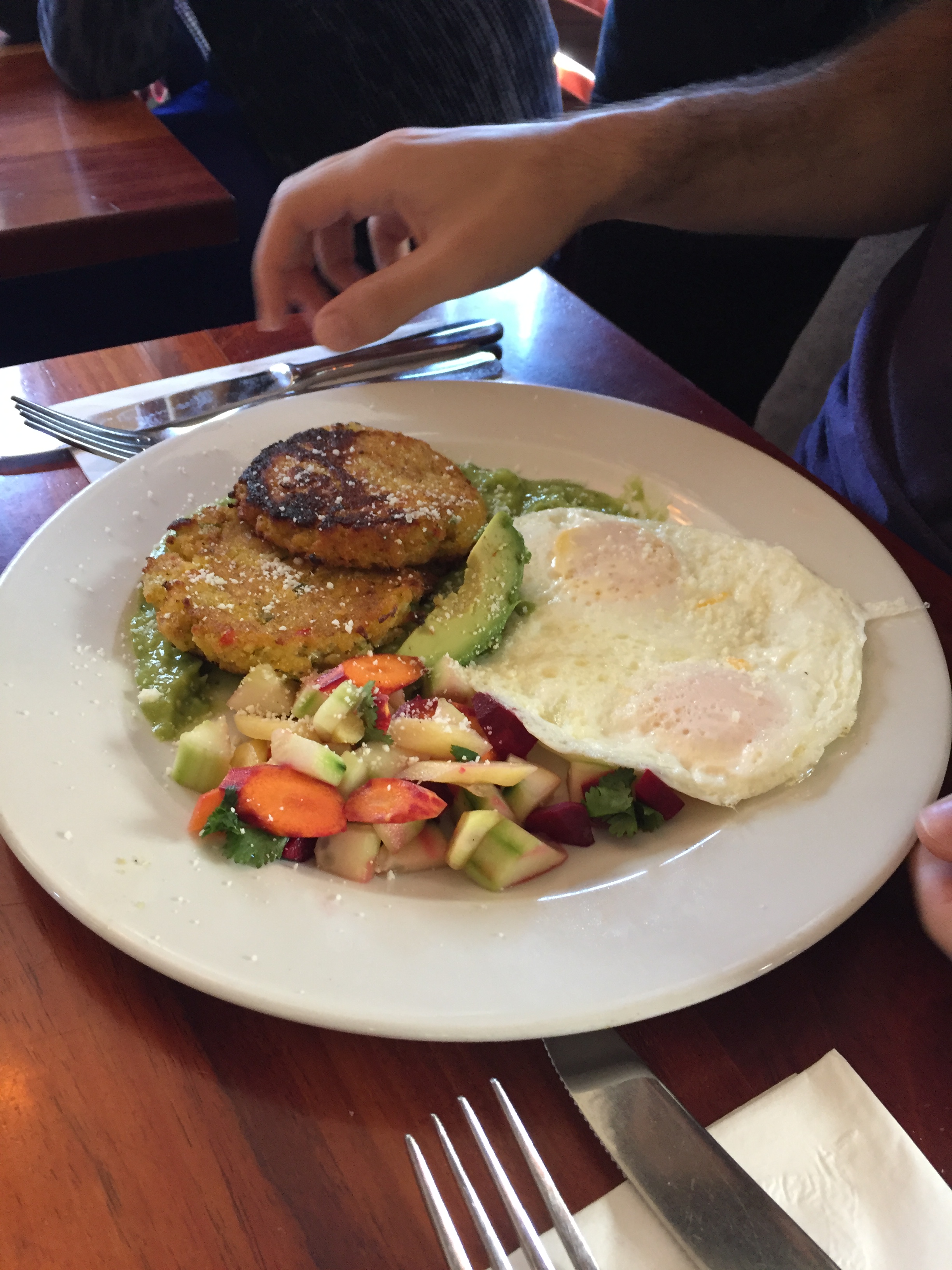 Not having brunch plans before leaving your house in a major city on a Sunday is a rookie mistake that we committed today. After trying several places, we finally found a place willing to take our money in exchange for food- Olea, offering “simple Californian fare”. While online rates were not stellar, we had limited options as we were approaching our afternoon plans and did not want to go without eating. While we were seated immediately, there was a decent line when we got our food and even when we left. I got the challah custard toast with strawberries, Kevin had the BLT and avocado sandwich, and my brother got the sweet corn cakes with eggs, tomatillo and avocado sauce, Cotija cheese, and plantains (had to look that one up!). We all agreed that we were very impressed with our meal- perhaps because we did not have expectations or build up when we got there since it was a last minute decision, but it was very good!