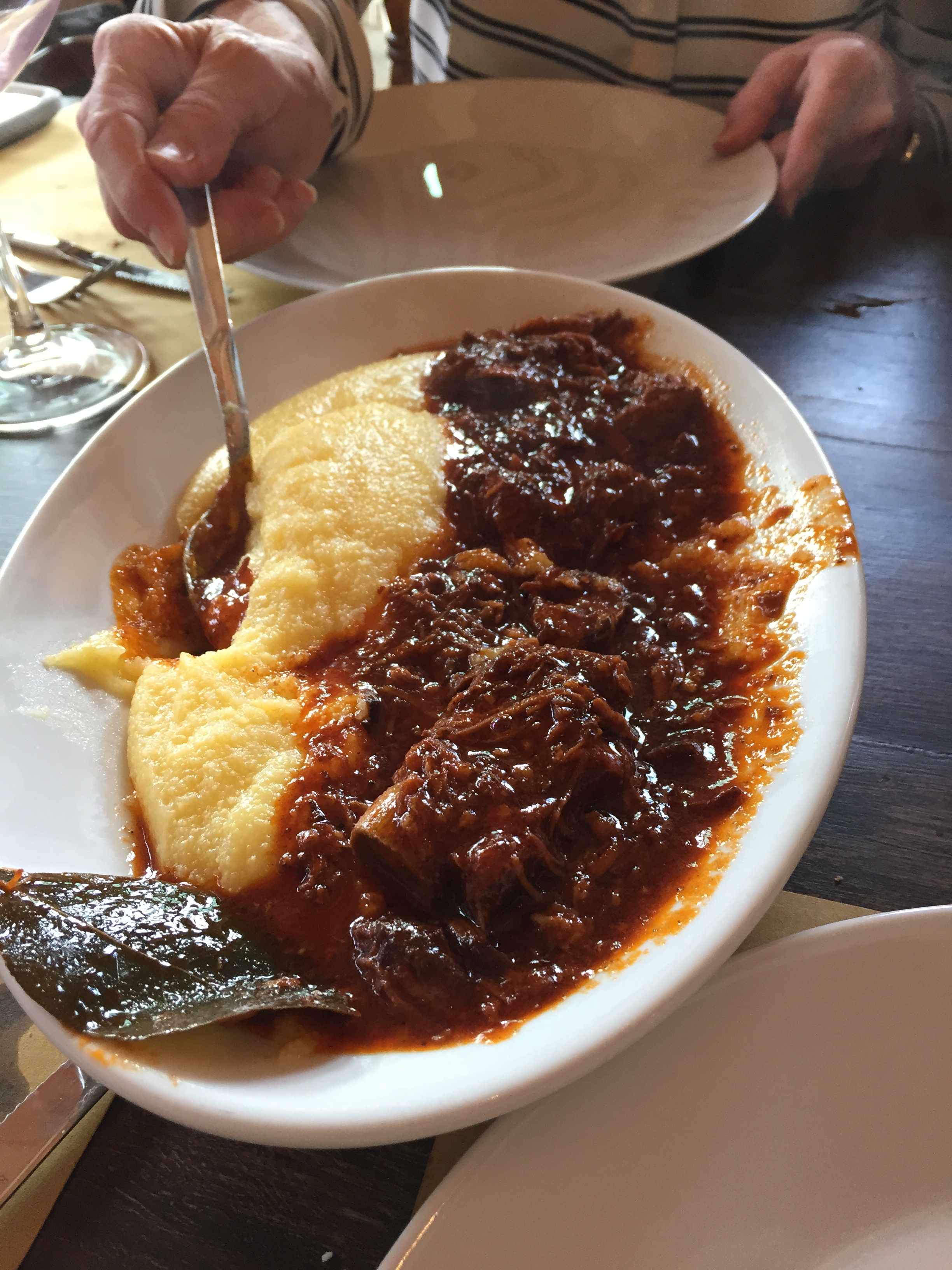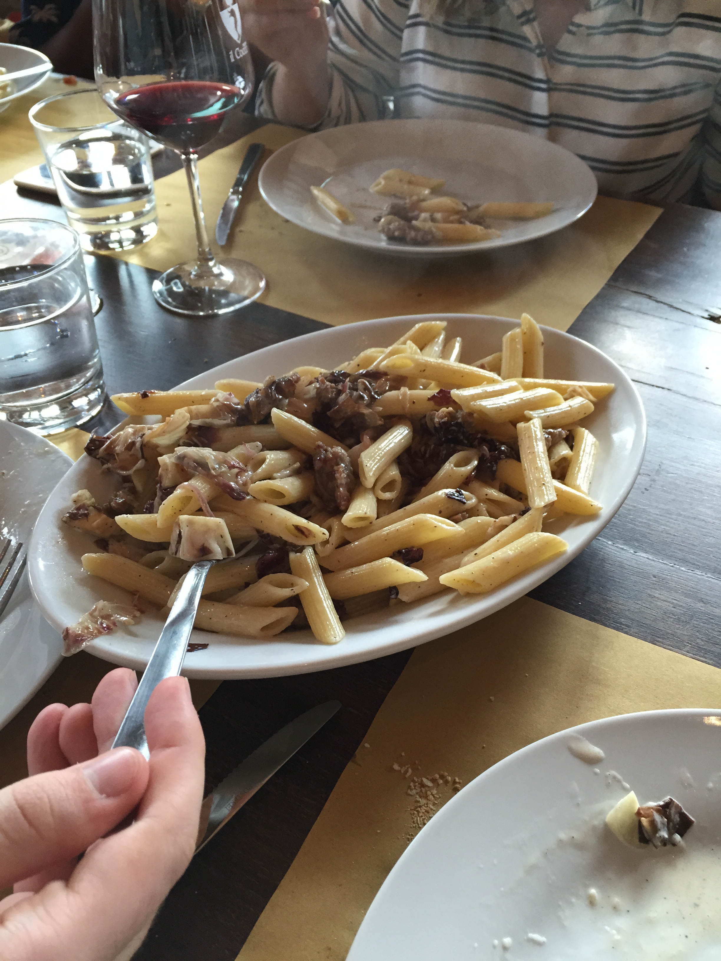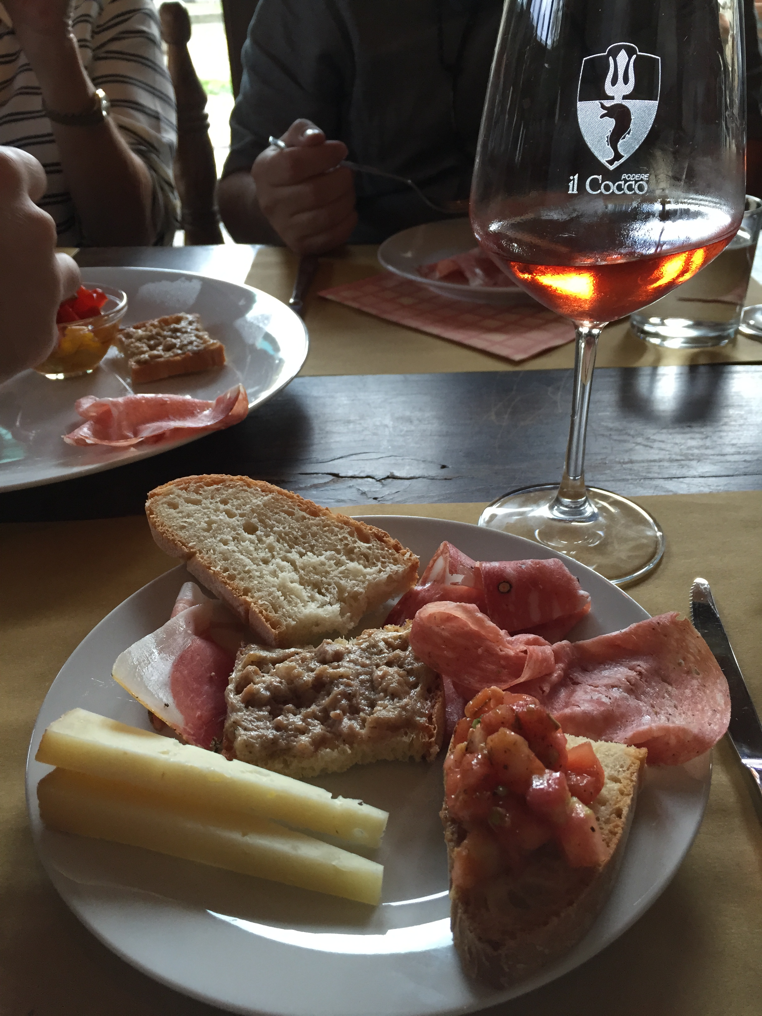 The next stop on our journey was lunch at agriturismo Podere il Cocco. On the tables waiting for us was a spread of meats, cheeses. and bruschetta- all very tasty! The first course (primi) was penne and ricchiodo, sausage and cream sauce. The second course (secondi) was roasted rubs and polenta. Homemade cannoli cake was for dessert. Along with all the delicious food, we had tastings of the wine produced by the vineyard, which was in no short supply. Bottles around the table and you helped yourself- our kind of tasting experience!