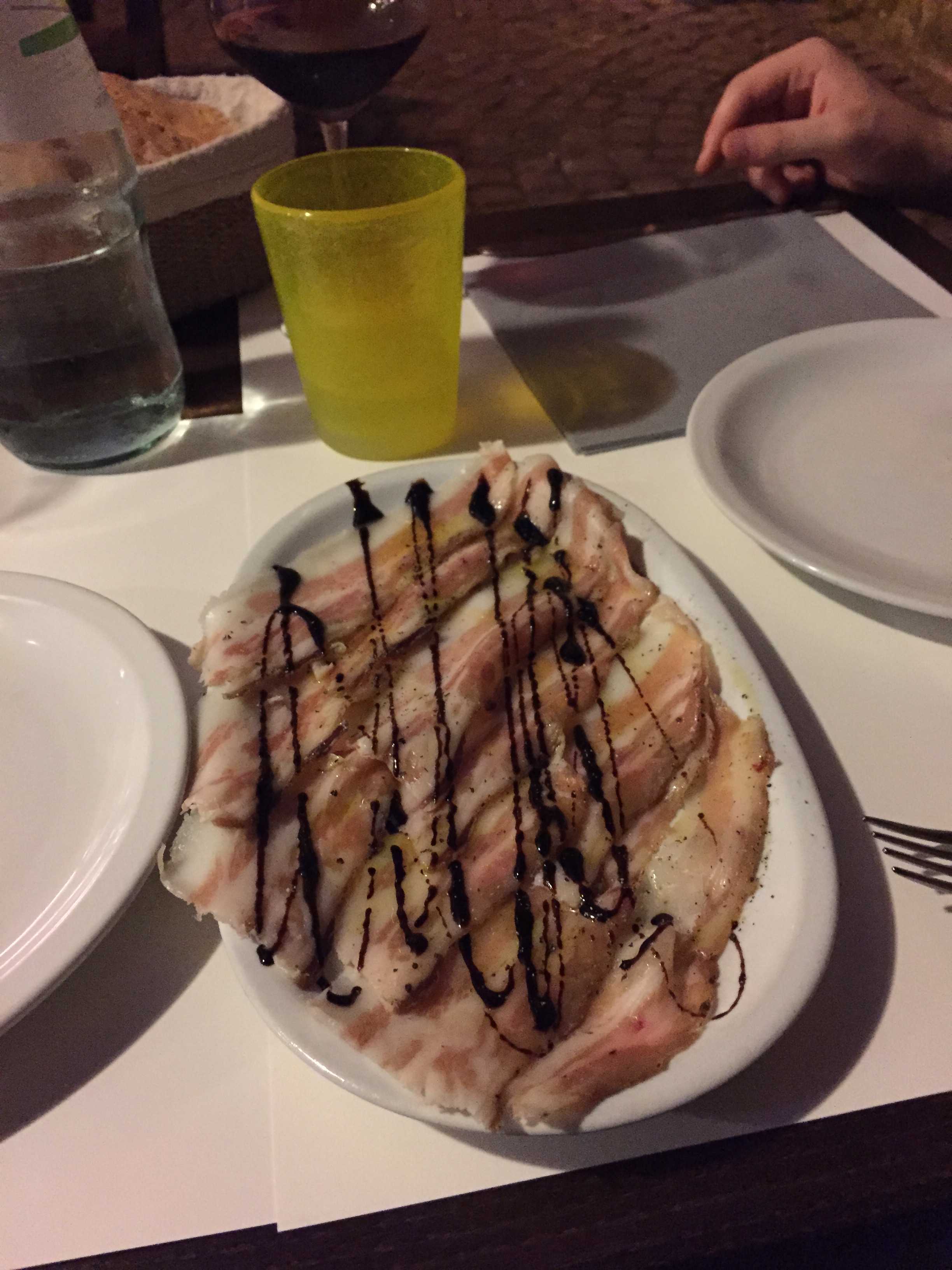 We found Trattoria da Carlo down an alley and we sat at an outside table under string lights. Kevin had wanted to try pork cheek so we gave it a go. When Carlo brought the dish drizzled in balsamic vinegar, he also gave us a huge basket of bread in a “you are going to need this” manner. While ordering this was not a mistake, it definitely had an inedible characteristic- it was so fatty and I understand why the bread was brought out as it helped absorb the pork cheek. A memorable experience….ha! I had the ravioli special and Kevin ordered the cacio e pepe (“cheese and pepper”), a traditional pasta dish tossed simply with grated cheese and ground pepper. I think that is what we loved so much about the food in Italy- it is not like pasta dishes in the USA- they are simple and showcase the pasta, not doused in a thick, overbearing sauce. The ingredients are fresh and pasta is not as filling or heavy as they are back home.