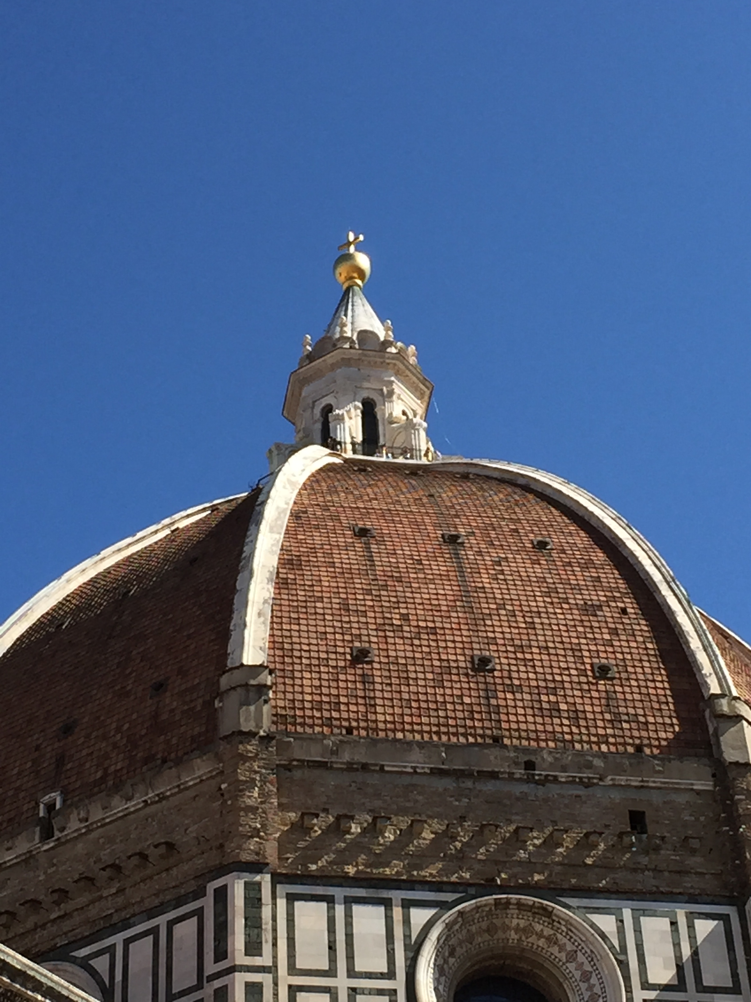 The climb up to the Cupola inside the Duomo was next on our list. I have to say, it was quite an experience that definitely had me realize a slight fear of heights! From a cardio perspective, it is not strenuous because there is frequent stopping on the way up- there are portions that are one person wide for bi-directional traffic- but there are 463 steps with no lift (so keep that in mind). What got me weak at the knees was the portion where you walk in interior perimeter of the dome with a glass wall for a full visual of the church below. An incredible view that had me simultaneously sweating in a mild panic. Once you reach the Cupola, you climb what resemble attic stairs onto the perch where you get the most expansive view of Florence and the surrounding towns.