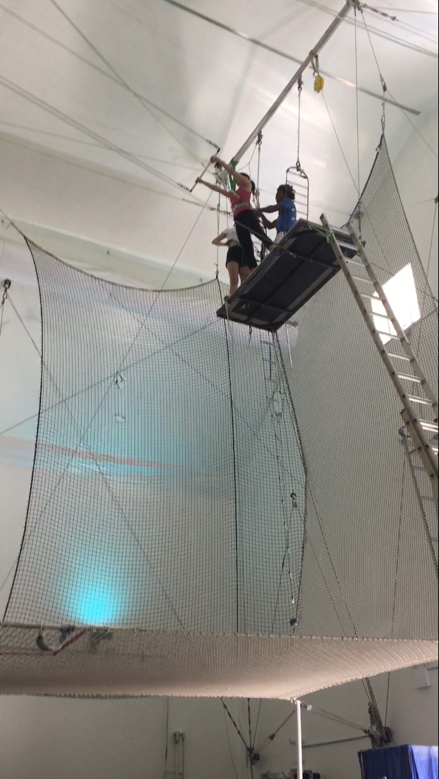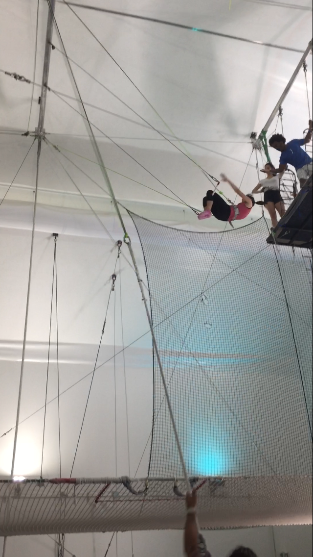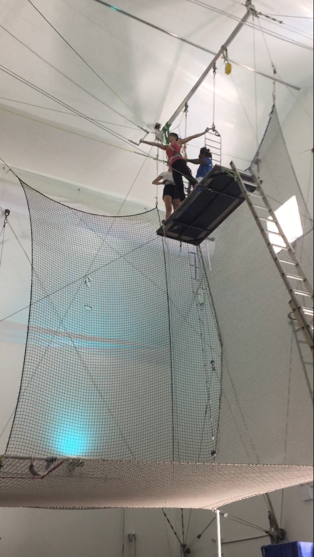 With both hands on the bar, bar above my shoulders, and hips thrusted forward, I heard my “READY”- bent my knees- then “HUP!- and I jumped. The fear then shape shifted into exhilaration- adrenaline of flying through the air! I heard the instructor on the ground then guide me through the choreography “KNEES UP” (knees up and over the bar) “HANDS OFF” (letting go of the bar and handing upside down) and several other maneuvers to then get you off the bar (including a backward flip).